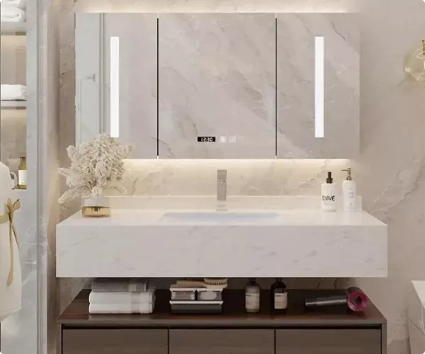 Introducing our Modern Marble Surface Smart LED Bathroom Mirror Cabinet and Sink Set, a perfect blend of functionality and elegance for your bathroom. This set is designed to cater to both practical needs and aesthetic pleasures, making it a must-have for modern homes, hotels, and villas. With its sleek design and smart features, it’s not just a bathroom fixture; it’s a lifestyle upgrade.